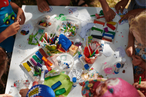 - Knutselhoek: Zet een knutseltafel op met kleurpotloden, papier en knutselspullen. Kinderen zijn dol op creatieve projecten, en ze kunnen hun eigen meesterwerken maken om mee naar huis te nemen.